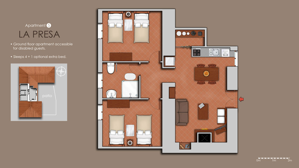 Total of 6 apartments, up to 26 guests. The accommodation includes a total of 11 bedrooms – eight twins and three doubles, plus additional beds available in four of the apartments. Groups renting the whole cortijo get exclusive use of the property, including swimming pool and dining room.