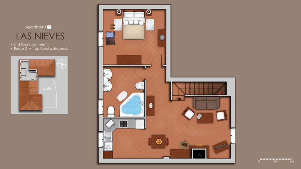 Superior one-bedroom apartment perfect for couples enjoying a romantic getaway. Bathroom with jacuzzi bath. Sleeps 2 + 1 optional extra bed.